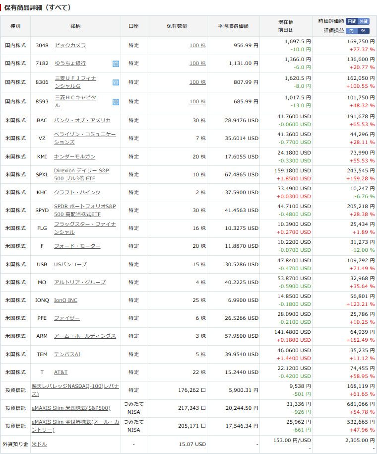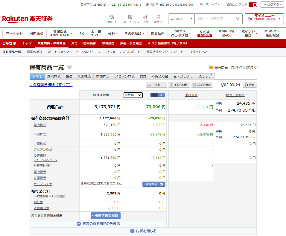 楽天証券口座は相変わらず・・・。動くのは米個別だけ