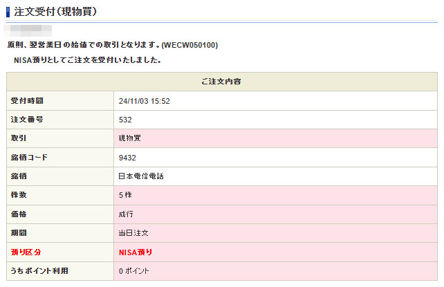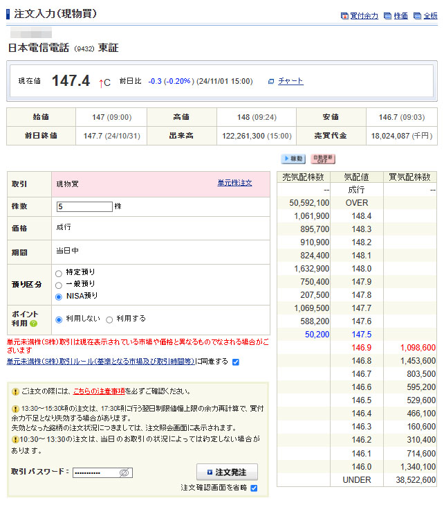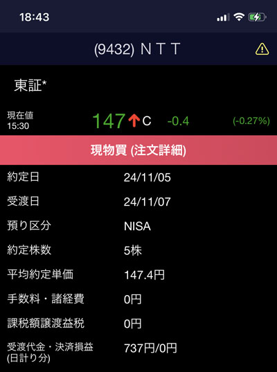 余力がまだ少しあるので「日本電信電話」を5株追加します。
