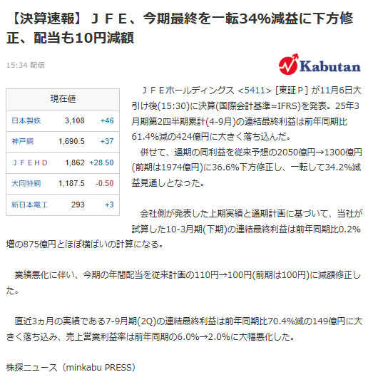 JFEホールディングス(5411)減配😂😂😂 PTSで大幅に下落してると思ったら 最終利益を下方修正。。。さらに減配の発表。 これは下げます。。。業績連動なので仕方ありません。 ・・・ですが10円 増配分、そのまま減配。まぁ辛抱の時期でしょう。 景気に左右される業界なのでマクロ的な要因もあるし・・・。もちろん私は売りませんがw 100円に減配しても今日の株価1,862で計算すると利回りはまだ5.37% 個人的にこれで「住友化学」に続いての減配を経験しました。 米国のFLGも事実上の減配ですが。。。