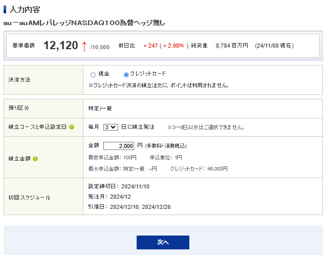 その減額した2,000円分をSBI証券で「auAMレバナス(為替ヘッジなし)」にそのまま積立てる事にしました。