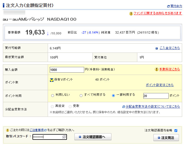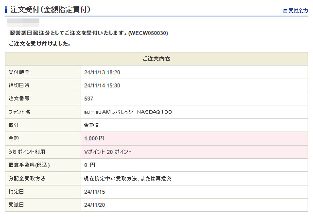 Vポイントが入ったのでauAMレバレッジNASDAQ100を1,000円分追加|2024.11.13 Vポイントが入ったので「auAMレバレッジNASDAQ100」へ何時ものように1,000円分入金します。 今回入ったのは・・・ SBI証券 投信マイレージ分の40ポイントです。あれ?マイレージも随分増えましたねw 為替はドル円155.00なので今回も「為替ヘッジあり」です。 ポイントは半分の20ポイントを利用して口座からの現金持ち出しは980円となります。 約定は金曜日の11月15日です。なんとか今週末には間に合います。