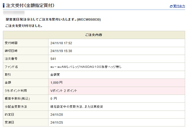 Vポイントが入ったのでauAMレバレッジNASDAQ100為替ヘッジ無しを1,000円分追加|2024.11.18 今回はイレギュラーで「auAMレバレッジNASDAQ100為替ヘッジ無し」にも1,000円分投入します。もちろん微々たるものですがVポイントは利用しますw ちなみに為替は円ドル154.81・・と更に円安が進んでいます。 「auAMレバレッジNASDAQ100為替ヘッジ無し」特定口座になります。 こちらもVポイント2ポイント利用して現金は998円の出金。 約定は11月20日(水曜日)です。