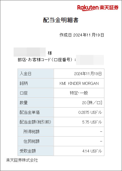キンダー・モルガン(KMI)から配当がありました|2024.11.19 キンダー・モルガンからの配当が楽天証券口座に入りました。 予定通りで $0.2875×20株=$5.75 $5.75×0.9=$5.175 $5.175×0.8=$4.14 KMIもトランプ銘柄なのか?大統領選以降株価は上昇しています。 ・・・ので買い増しできません。