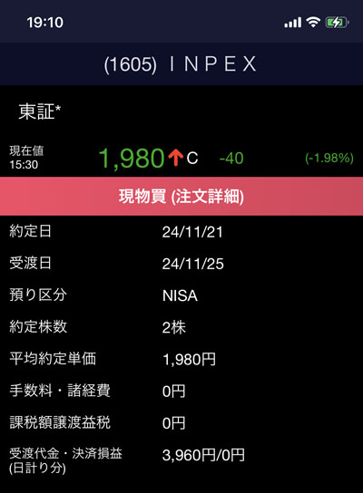 年内に10株保有にしたかった「INPEX」が朝やや大きめに下げていて株価が2,000円を割っていたので2株だけ追加購入する事にしました。