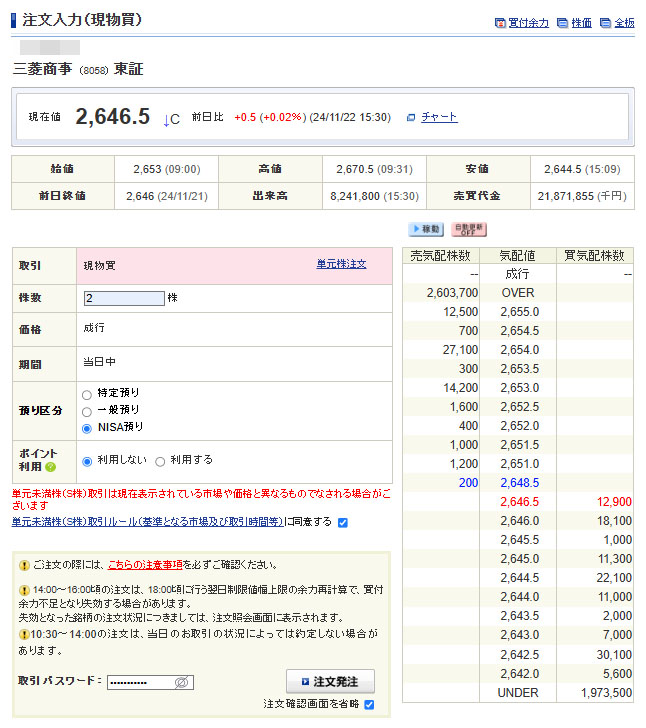 やはり上げてスタート。2,654.5円で約定しました。