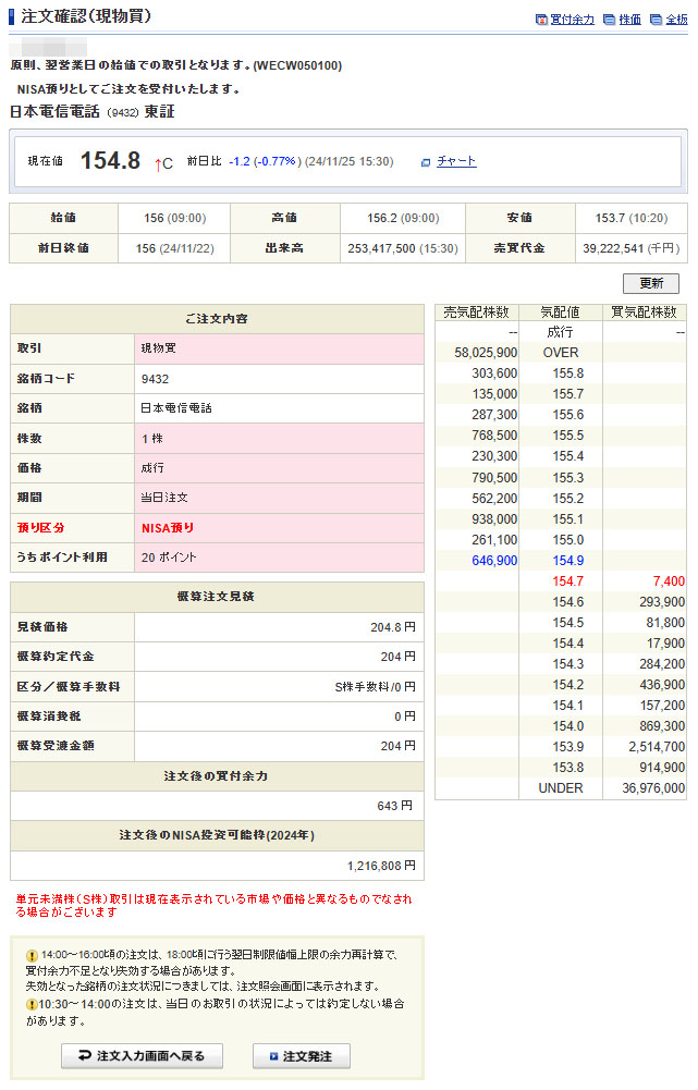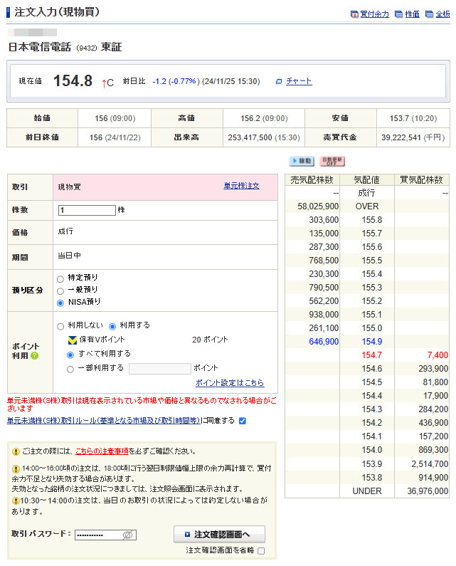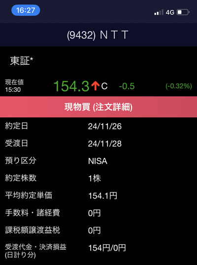 今回はSBI証券で個別株を買うのに「Vポイント」が使えるかの実証実験w の為ですので含み損で一番安価なNTTを1株買ってみるとこにしました。