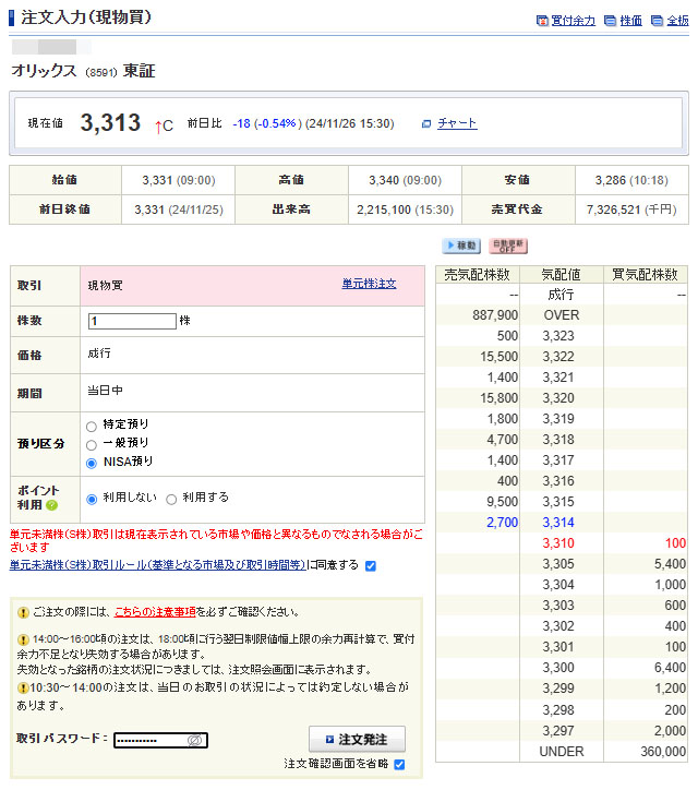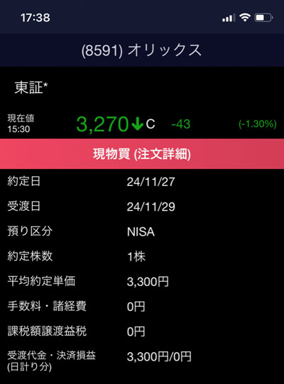 明日の9:00に約定します。これでオリックスはNISAで2株になる予定。