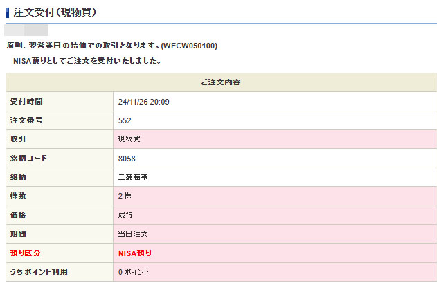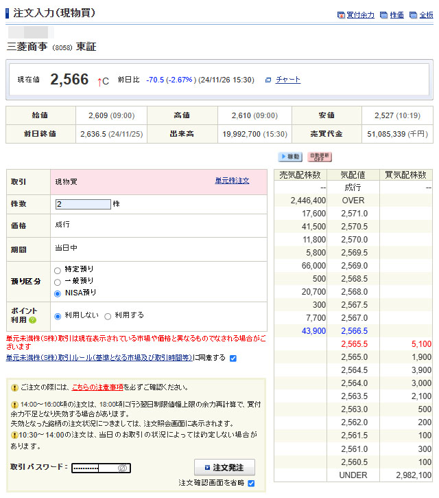 昨日、年内はもう買わない・・・とか書きましたが今日大きく下げた「三菱商事」を堪らず2株追加しますw -70円(