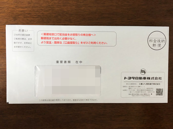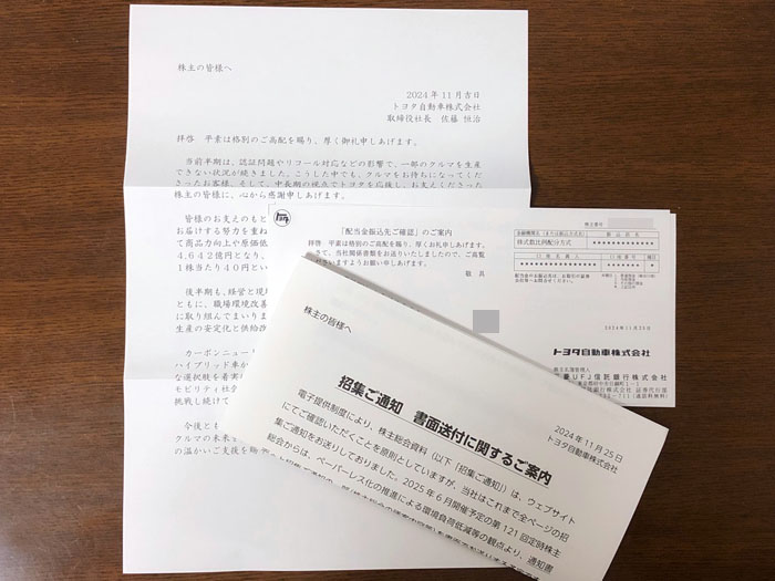 トヨタ自動車(7203)から重要書類が届きました。|2024.11.27 トヨタから「重要書類」が届きました! 定型の洋0封筒。 私は単元未満株主なので冊子はなく「株主の皆様へ」の手紙と「中間配当金計算書」「配当金振込先ご確認の案内」と「招集ご通知 書面送付に関するご案内」の4枚。 配当は40円。 「招集ご通知 書面送付に関するご案内」は今後郵送での案内は無くなるようです。私は議決権ないので今のところ関係ありませんwww