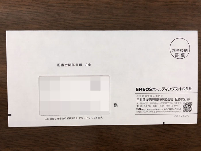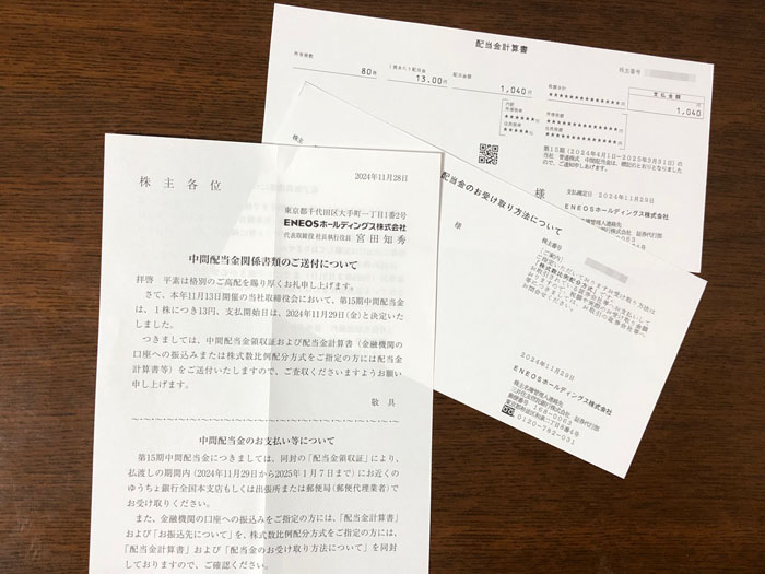 ENEOSホールディングス(5020)から配当金関係書類が届きました。 ENEOSホールディングスから「配当金関係書類」が届きました。 定型の洋0封筒 中身は「配当金計算書」「配当金のお受け取り方法について」「中間配当金関係書類のご送付について」の3種でした。 私は単元未満株主なので簡素なのかも? 特にWEBへの誘導もないし、100株持ってればパンフ的なものも同梱されると思います。