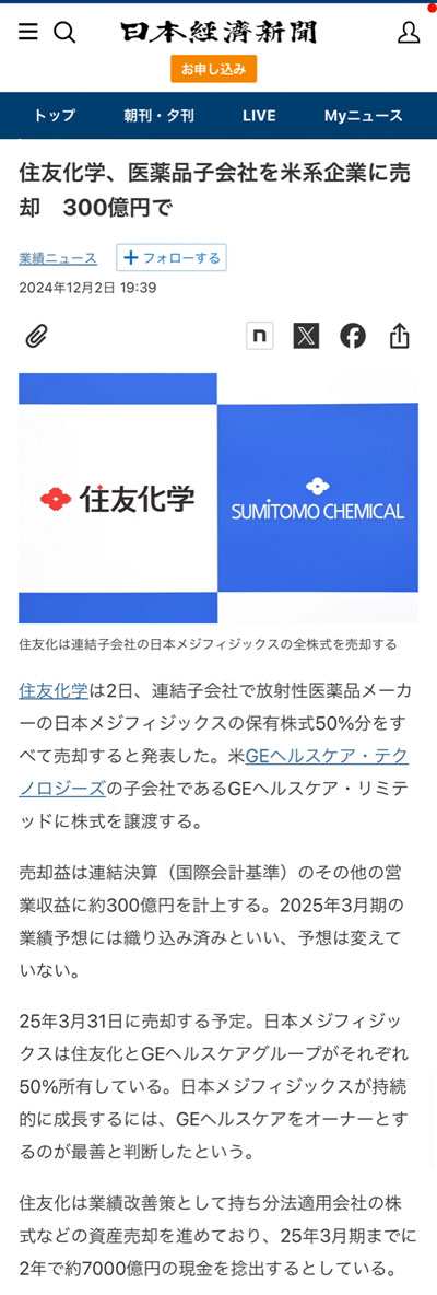 昨日の日経電子版ですが住友化学が子会社の「日本メジフィジックス」を売却したようです。