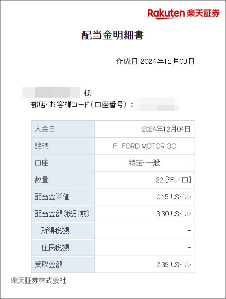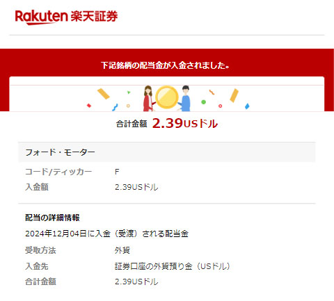 先日22株に買いました「フォード」から配当が入ったお知らせメールがら楽天証券から届きました。