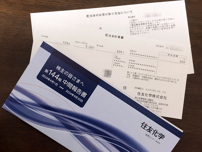 「株主の皆さまへ 第144期中間報告書」「配当金計算書」「配当金の受け取り方法について」の3種が封入。
