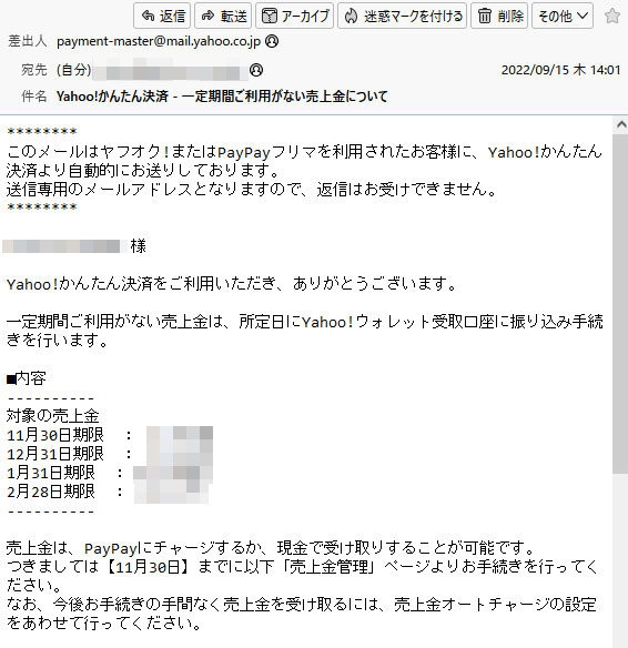 資金移動(ヤフオク→楽天銀行)2022年9月 コメントを残す もう少し溜まってから・・・と思いましたが こんなメールが来たので Yahoo!ウォレットに振り込まれるとどうなるのか?分かりませんのでwww 今回は14万6000円程ですが楽天銀行口座へ移動しました。 現在、楽天銀行普通口座には86万6000円残っているのでピッタリ100万ぐらいになります。このまま25日まで減らなければ来月も「VIP」継続です。(多分、最後になるかと・・・笑)