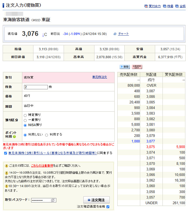 ヤフオクで細々したものが数点落ちて口座に少しだけ資金が入ったので「東海旅客鉄道」を2株買い増します。