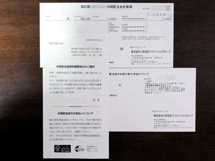 三井住友フィナンシャルグループ(8316)から封書が届きました|2024.12.5 三井住友フィナンシャルグループから一見してw 株式関連の封書が届きました。 グリーンの印刷の洋0封筒。 中身はシンプルに「第23期中間配当金計算書」「配当金のお受け取り方法について」と「中間配当金関係書類送付のご案内」 特に冊子もなくWEBサイトへの導線もありません。 三井住友フィナンシャルグループは高配当で堅実な企業ですので手持ちを増やしたい銘柄の上位です。なかなか株価は下がりませんが来春になり個人年金が入ったらある程度まとめて買ってもイイかな~と考えています。