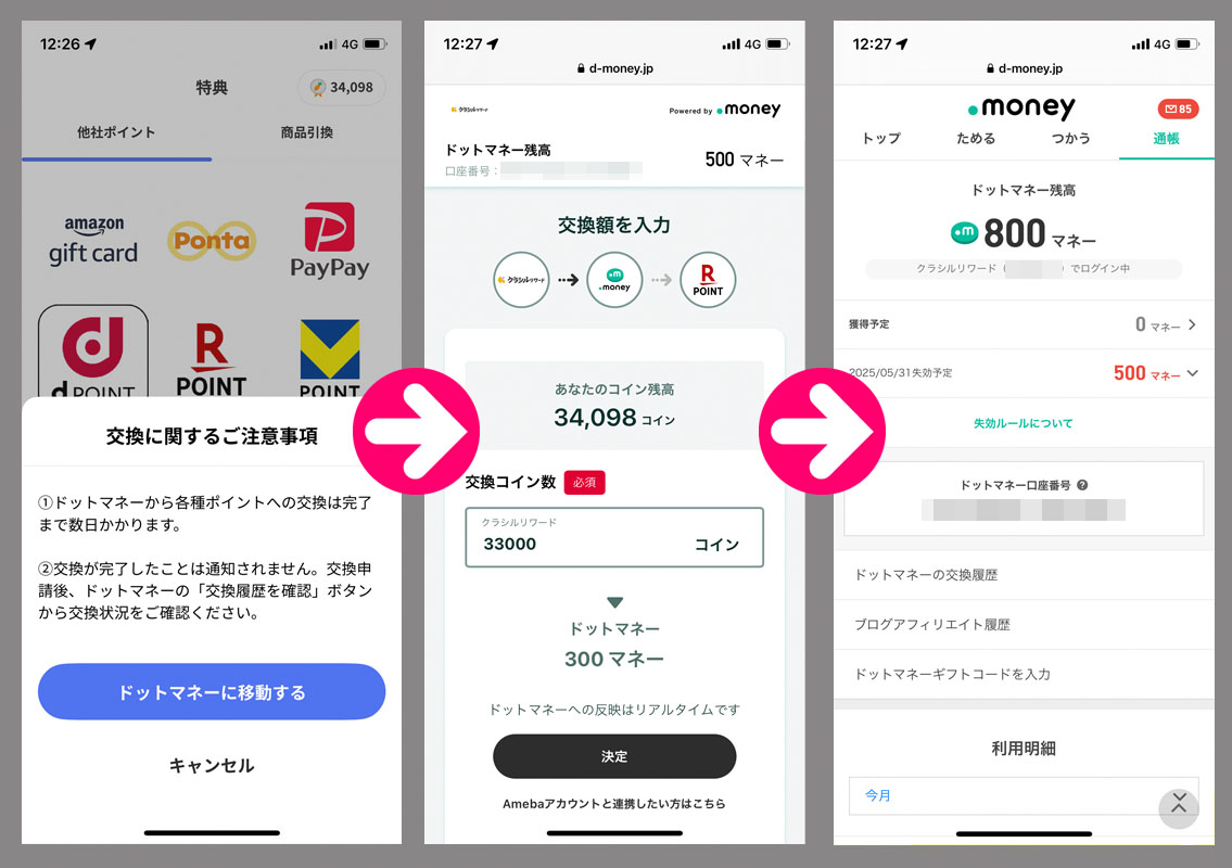 クラシルリワードのコインが33,000になったのでドットマネーに交換します。