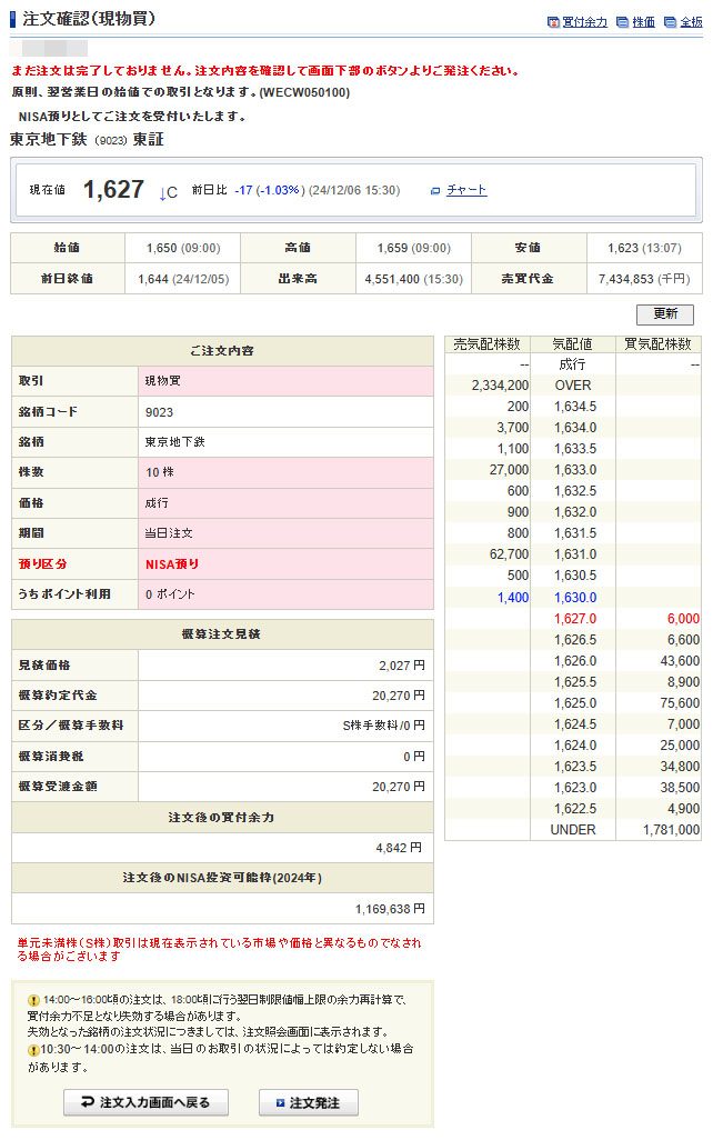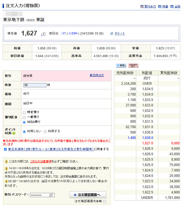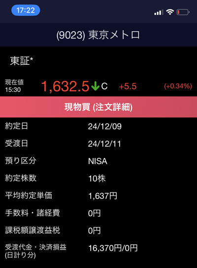 東京地下鉄はこれが最初の購入なので10株。NISA口座で平均は買値の1,637円です。目指せ200株w