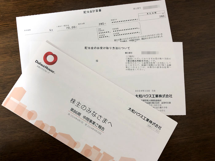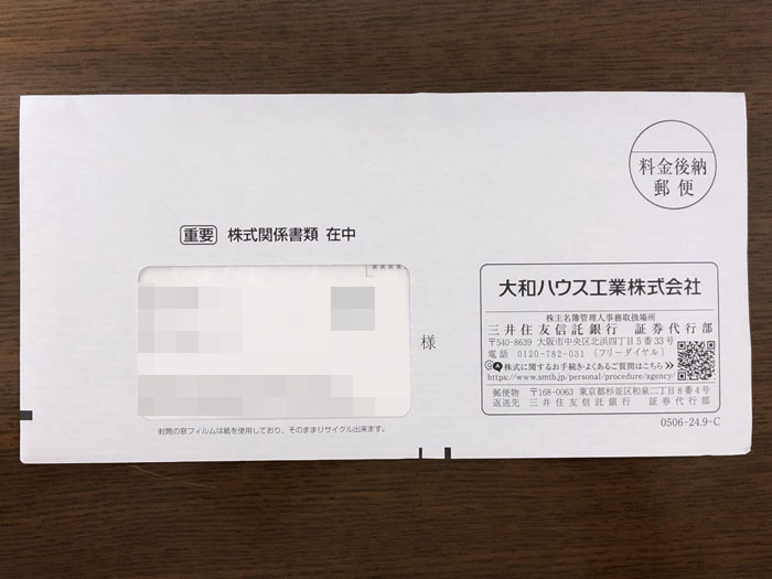4株しか保有の無い「大和ハウス工業」からも株式関係書類が届きました。