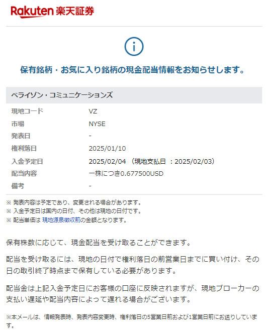 ベライゾン・コミュニケーションズ(VZ)配当予告 2025.2月分 楽天証券からベライゾン・コミュニケーションズの配当予告のお知らせが来ました。 今回から予告もHTML形式のメールになりました。 ベライゾンは7株保有しています $0.6775×7株=$4.7425 $4.7425×0.9=$4.26825 $4.26825×0.79685=$3.4・・・で前回は$3.42でした。