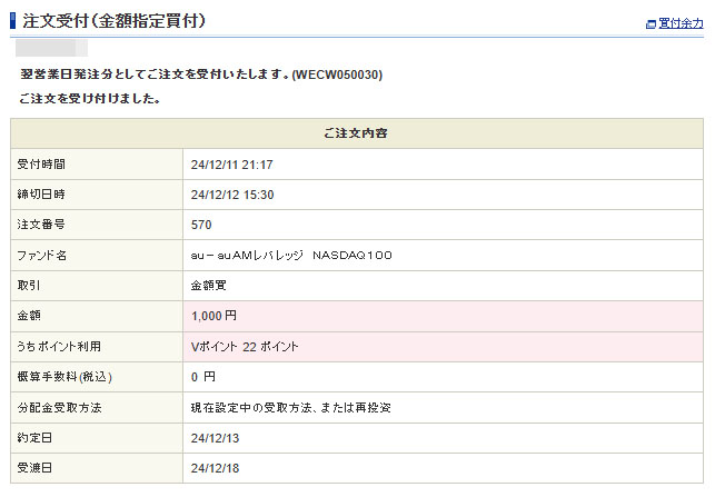 Vポイントが入ったのでauAMレバレッジNASDAQ100を1,000円分追加|2024.12.11