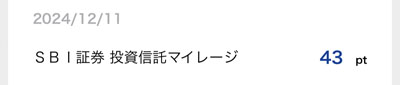 今回入ったのは「SBI証券 投資信託マイレージ」43ポイント分です。