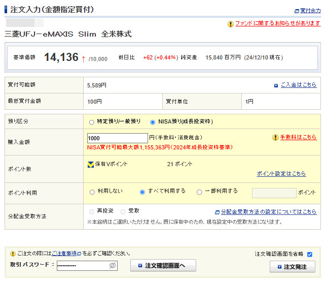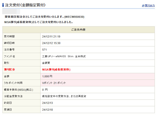 Vポイントが入ったのでeMAXIS Slim 全米株式を1,000円分追加|2024.12.11 今回は「eMAXIS Slim 全米株式」へも約半分の21ポイントを利用して1,000円分追加します。 何時ものようにNISA口座です。 約定は明後日の13日(金曜日)