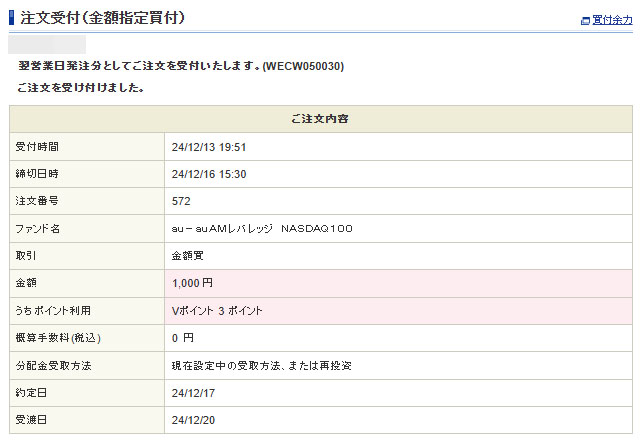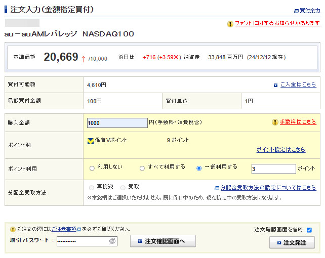 Vポイントが入ったので「auAMレバレッジNASDAQ100」へ1,000円分の入金!