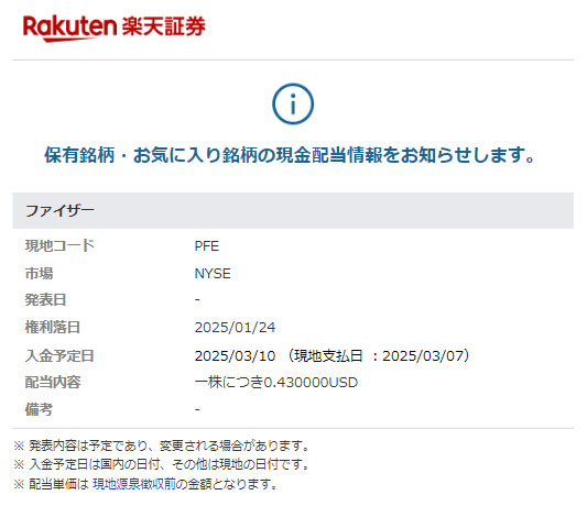 ファイザー(PFE)配当予告 2025.3月分 ファイザーの配当予告の案内メールが楽天証券から届きました。 ファイザーは今のところ6株保有しています。 配当は1セント増えて$0.43になっています・・・が何かの調整でしょうか? 6株×$0.43=$2.58 $2.58×0.9=$2.322 $2.322×0.8≒1.8576 なので$1.86かな???
