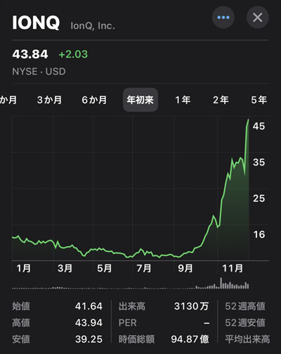 イオンキュー(IONQ)セクスタプルバガー🍔🍔🍔🍔🍔🍔|2024.12.18 昨夜のNYで終値ベースで6倍となりました。 「セクスタプルバガー」という言葉があるのかは知りませんwww 単にシックスバガーっていうのかも・・・テンバガーだしw ザラ場ではあったかもしれませんが終値で$43.84 購入株価が$6.77なので6倍以上です! 5株売りましたが今後は20株保有で楽しもうと思っています。