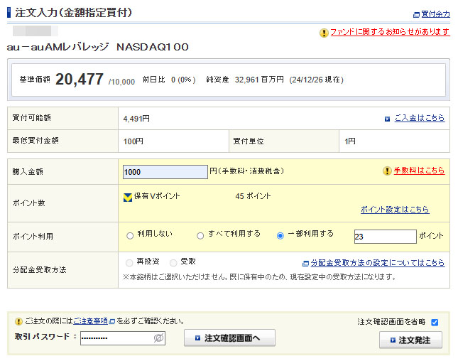Vポイントが入ったので「auAMレバレッジNASDAQ100」へ1,000円分追加入金します。