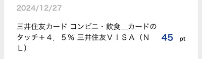 「三井住友カード コンビニ・飲食_カードのタッチ+4.5% 三井住友VISA(NL)」分で45ポイントです。