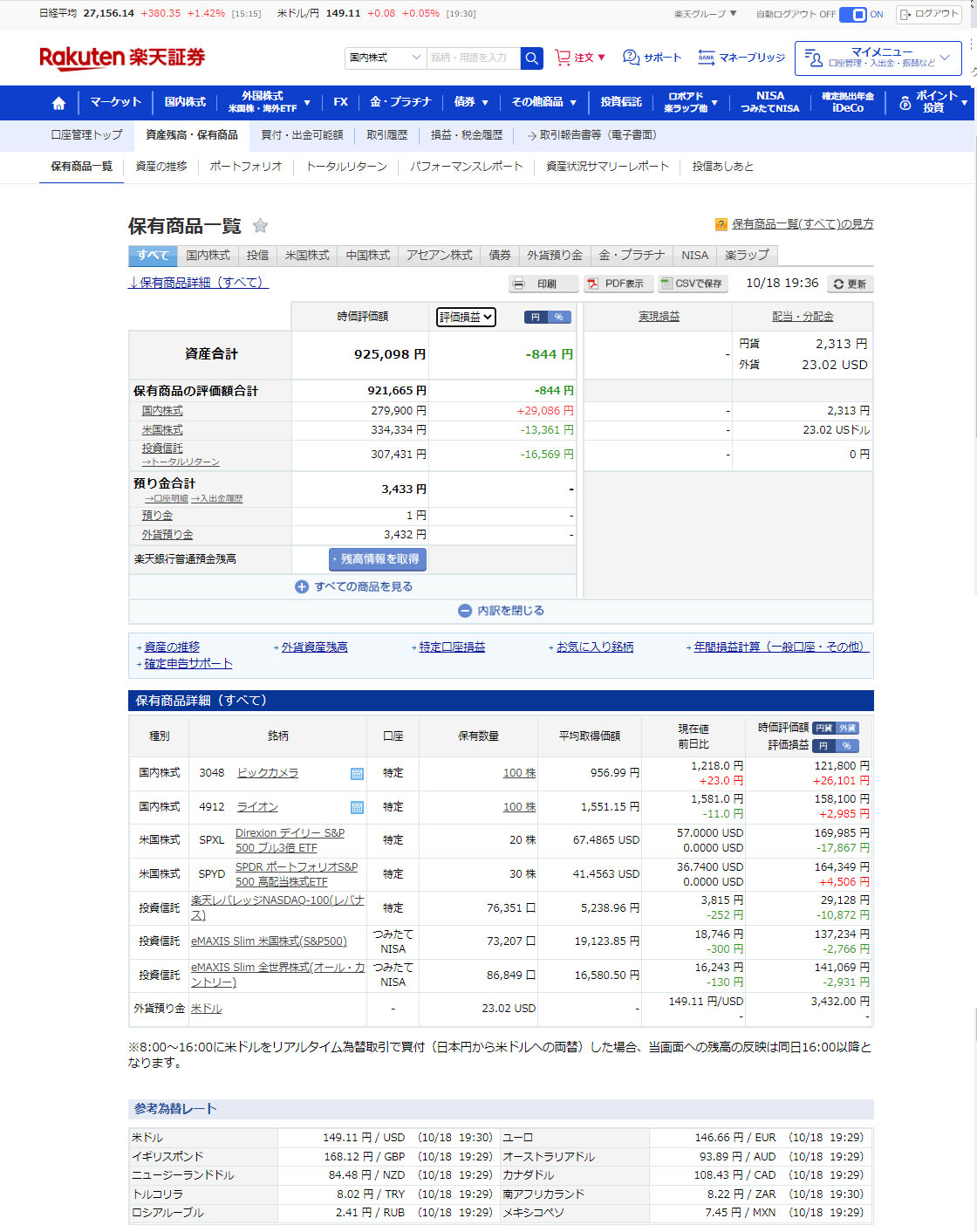 9月~10月には「SPXL」を10株ナンピン買いしたので米国株式の資産が増えています。