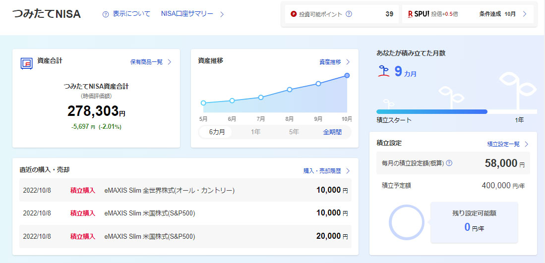 今月は8・9・10日と連休があったので「つみたてNISA」の約定は12日でした。