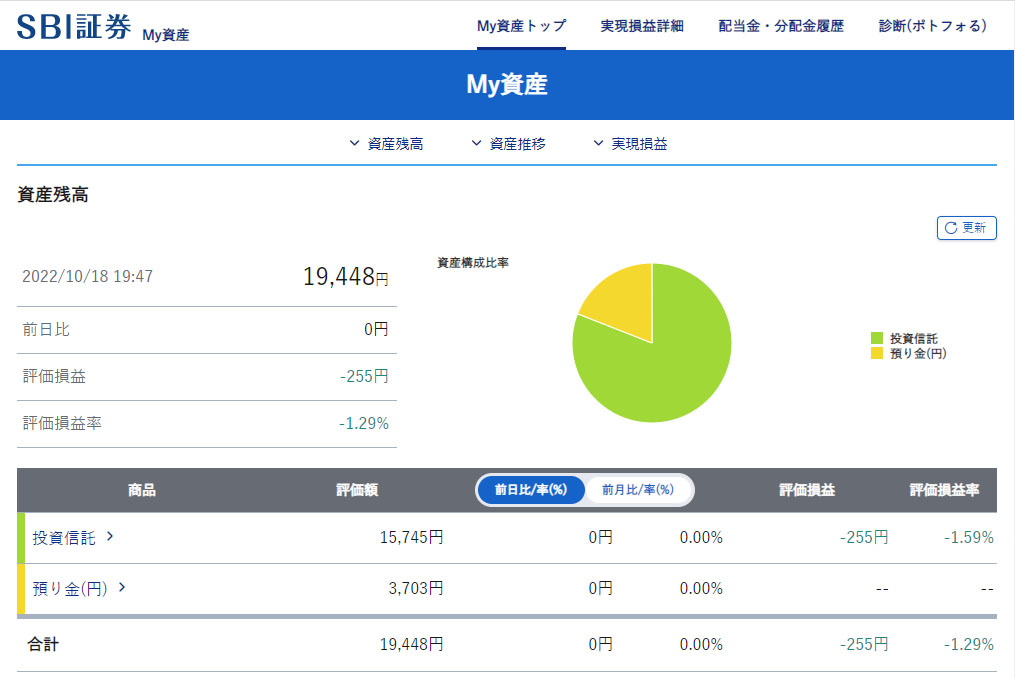 評価損は-255円となりました。割合は-1.29%なので楽天証券の「つみたてNISA」より低い。オルカンもあるからかもしれないけど。