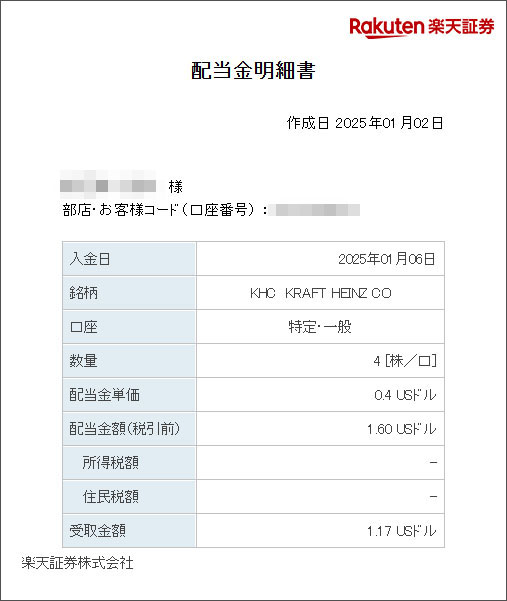 クラフト・ハインツ(KHC)から配当がありました|2025.1.2 クラフト・ハインツから配当が入りました。 バンカメと同じ日に入っていたようですが見落としていたようです。 今日こちらのメールで知りました。 今回から4株保有となりました。 $0.4×4株=$1.60 $1.60×0.9=$1.44 $1.44×0.8=$1.152・・・で、$1.17でした。 クラフト・ハインツはあまり業績が芳しくなく・・・下がってはいますが株価もそこそこで投資対象に(個人的に)イマイチなりにくいのがネックで株数が増えません。。。