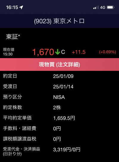 これで東京地下鉄(東京メトロ)は全てNISA口座で17株の保有となり平均取得単価は1,624と2株で2円も上がってしまった。。。