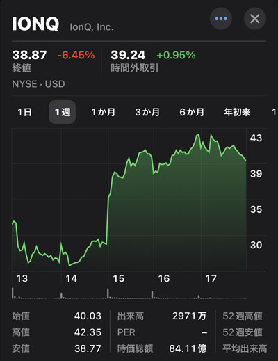 イオンキュー(IONQ)|2025年1月第3週|$38.87 大暴落後もボラティリティがある値動きで週間ではプラス 昨晩(米国17日)は6%の下げでした。 現在、大暴落後半値戻し程度の回復です。$40辺りで下地固めならイイのですが・・・ほかの量子は下げトレンドに転換っぽいのでIONQも今後は全く予想もつかない。