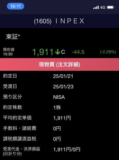 これで「INPEX」は全てNISA口座で11株の保有となり平均取得単価は1,944。1株だけの購入でしたが3円ほど下げられました。