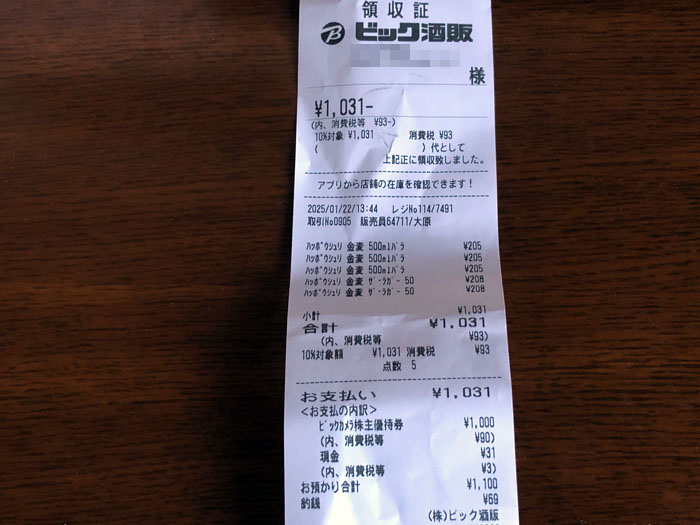 ビックカメラの株主優待券を使って⑨ ビックカメラから11月にいただいた株主優待券を「ビック酒販」で発泡酒と交換してきました。 今回は1,000円分利用で5本です。少し足が出ました。 いつもの金麦w 青缶の方は少し安くて205円。赤缶はアルコール度数が6%で208円です。 全て赤でも良かったのですが。今回も赤缶は2本しかなく青缶を3本です。 税込で1,031円 ビックカメラVIEWカードを忘れてしまい31円は現金で払いました。 まだ2,000円分残りがあるので5月末までには消費しないといけません・・・が、私の場合は期限が切れてしまうことはないでしょうw