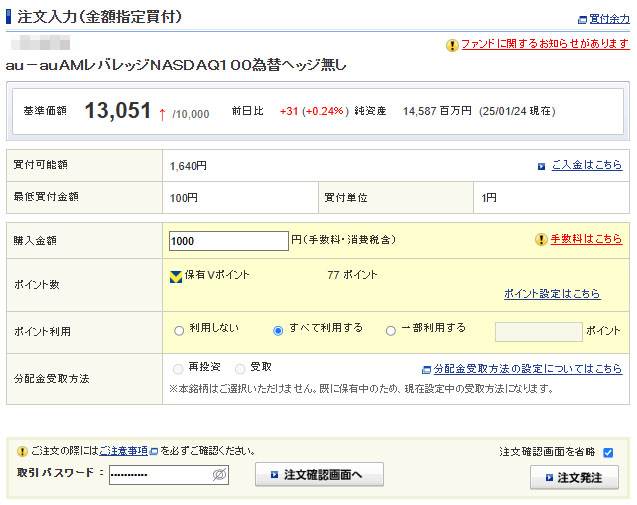Vポイントが入ったのでauAMレバレッジNASDAQ100為替ヘッジ無しを1,000円分追加|2025.1.25