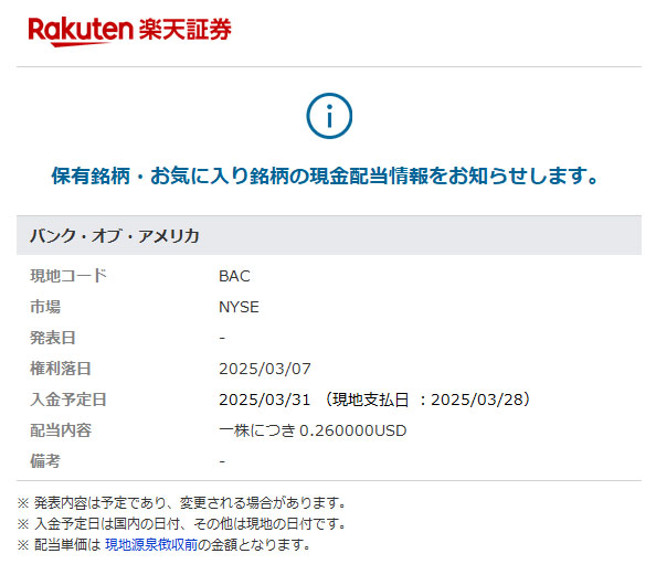 バンク・オブ・アメリカ(BAC)配当予告 2025.3 楽天証券からバンク・オブ・アメリカ(BAC)からの配当予告メールが来ました。 前回と変わらず $0.26×30株=$7.8 $7.8×0.9=$7.02 $7.02×0.8=$5.616 で、前回は$5.62でした。 バンカメは高配当銘柄ではないので今の株価での利回りは2.22%です。 私の所得株価からだと3.59%です・・・暴落時に買ったので。 直近の決算も良く、トランプの規制緩和期待で株かも上げています。