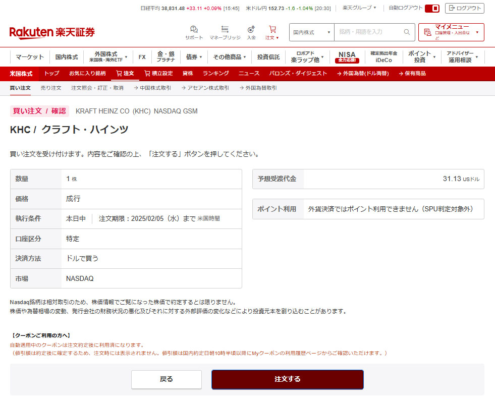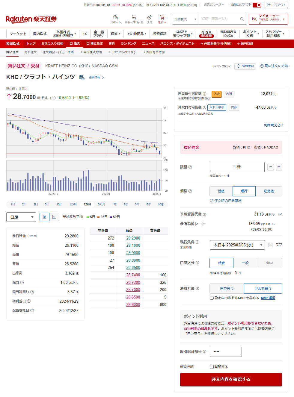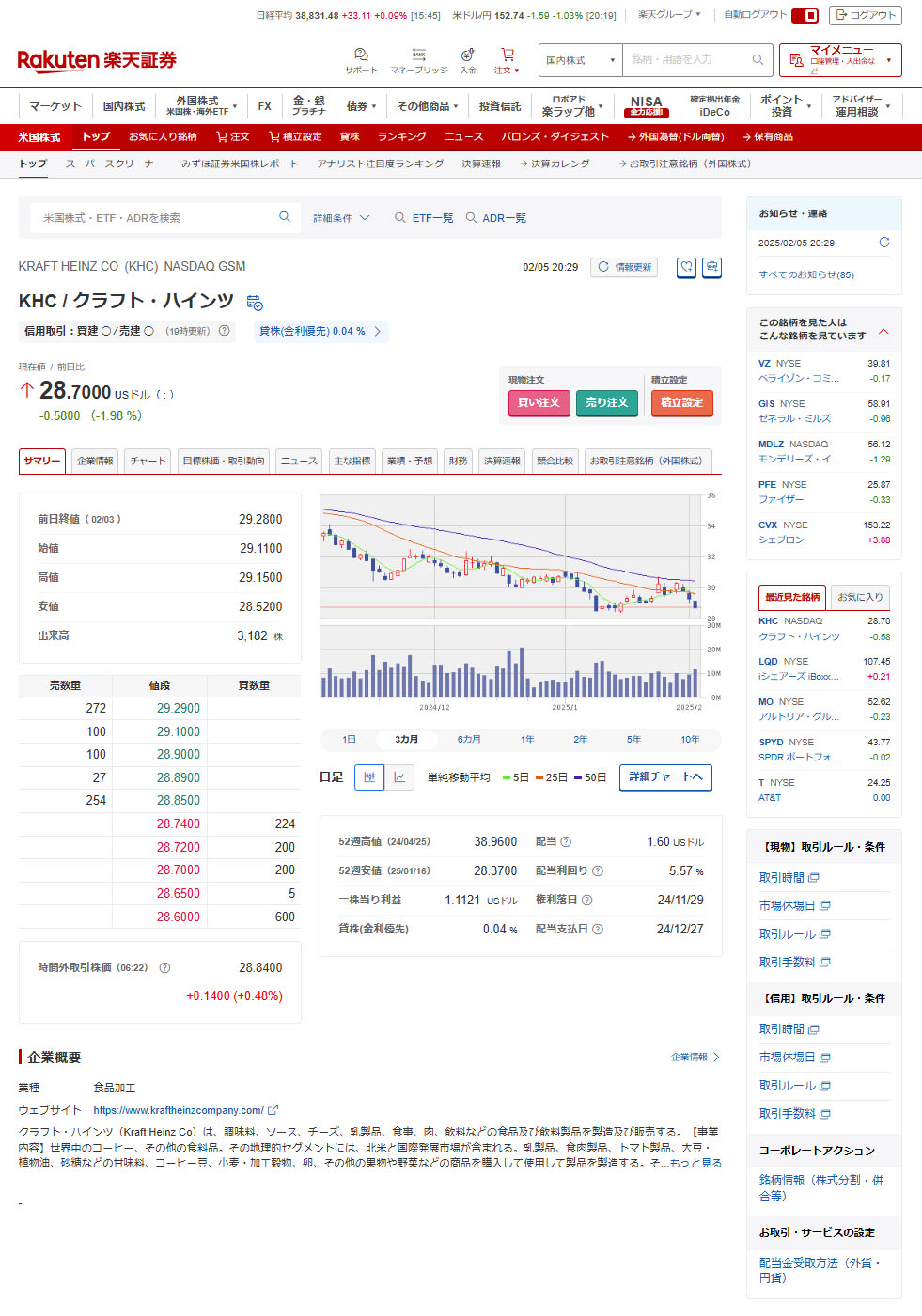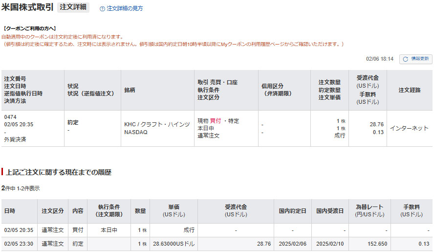 先日、IONQを売却した$が口座にあるので取り敢えず「クラフト・ハインツ(KHC)」を1株追加購入することにしました。