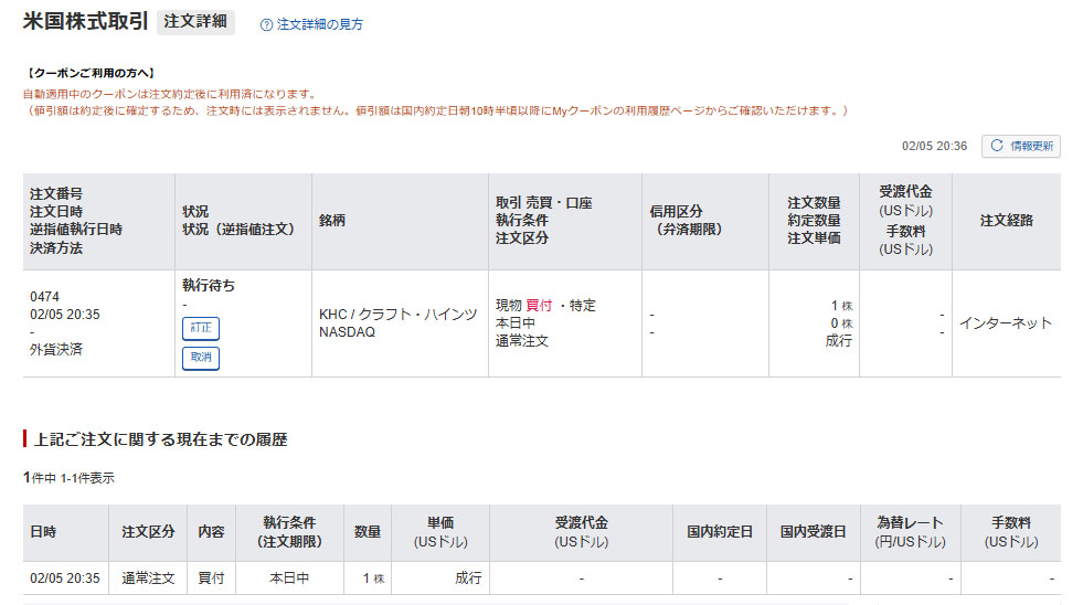 今回は単純に切りよく5株にしたくての購入なので「成行」での注文です。良くも悪くもKHCはかなり含み損が出てるのでさほどシビアな買い注文でなくても平均は下げられます。