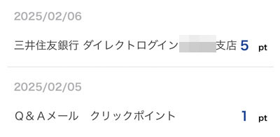 毎月月初に入る「三井住友銀行 ダイレクトログイン」分の5ポイントとおなじみの「Q&Aメール」の1ポイントで計6ポイント。