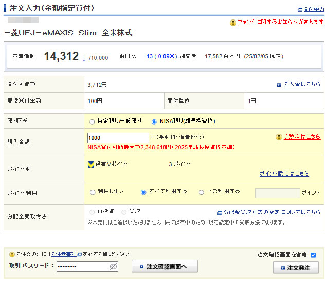 Vポイントが入ったのでeMAXIS Slim 全米株式を1,000円分追加|2025.2.6 そして今回も素直にあと半分は「eMAXIS Slim 全米株式」へ。 こちらはNISA口座(成長投資枠)で1,000円分。3ポイントを利用で現金は997円 約定は2月10日(月曜日)です。 最近思うになんだかんだ「レバナス」と「全米」の組み合わせがリスクリターンのバランスが自分好みかな?と。「全米」を「S&P500」にしても良いのですが「レバナス」は為替ヘッジ「あり」「なし」を臨機応変で・・・4月からもこのパターンかも?まだ考え中ですがwww
