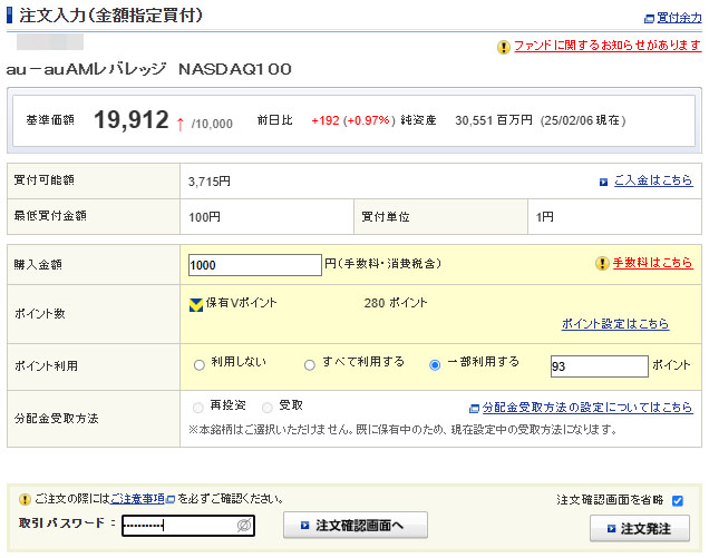 Vポイントが入ったのでauAMレバレッジNASDAQ100を1,000円分追加|2025.2.7 連日ですがVポイントが入ったので「auAMレバレッジNASDAQ100」へ1,000円分入金します。 今回入ったポイントは・・・ 「三井住友カード SBI証券 投信積立カード決済特典 三井住友VISA(NL)」の280ポイントです。 為替は ほぼ変わらずですがホンの少しだけ円高に・・・。 今回は為替ヘッジ「なし」「あり」両方に入れますがこちらは「あり」の方です。 ポイントは約1/3の93ポイントを利用して907円現金持ち出しです。 約定は2月13日(木曜日)です 11日が祝日の為、結構日数が経過しての約定です。米国は無関係なので市場は開いていますがどうなりますか?