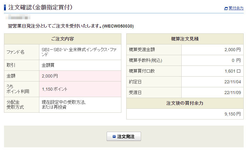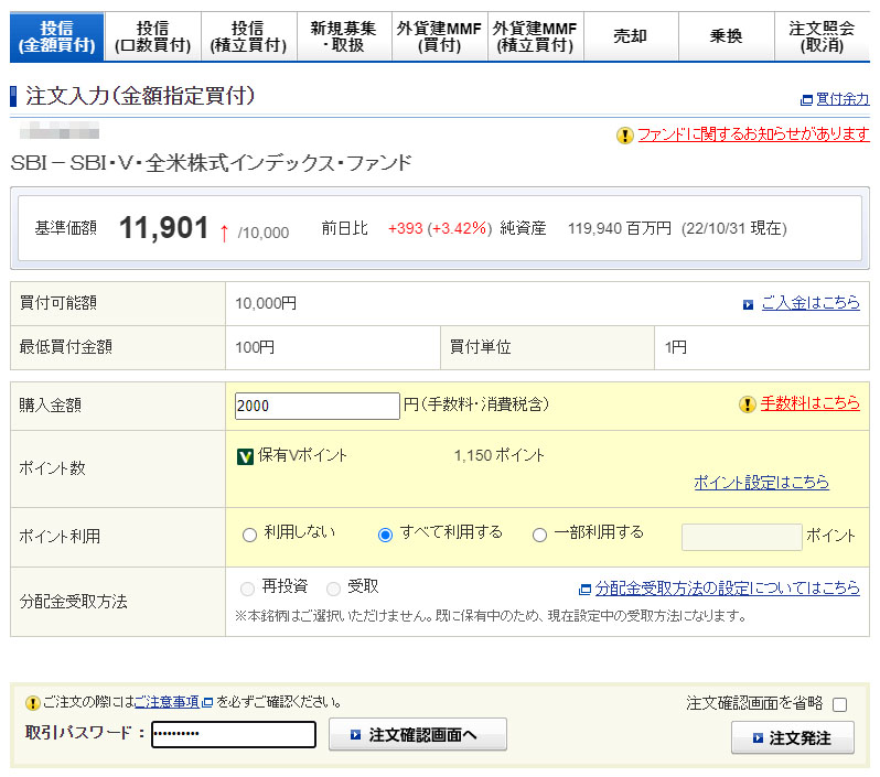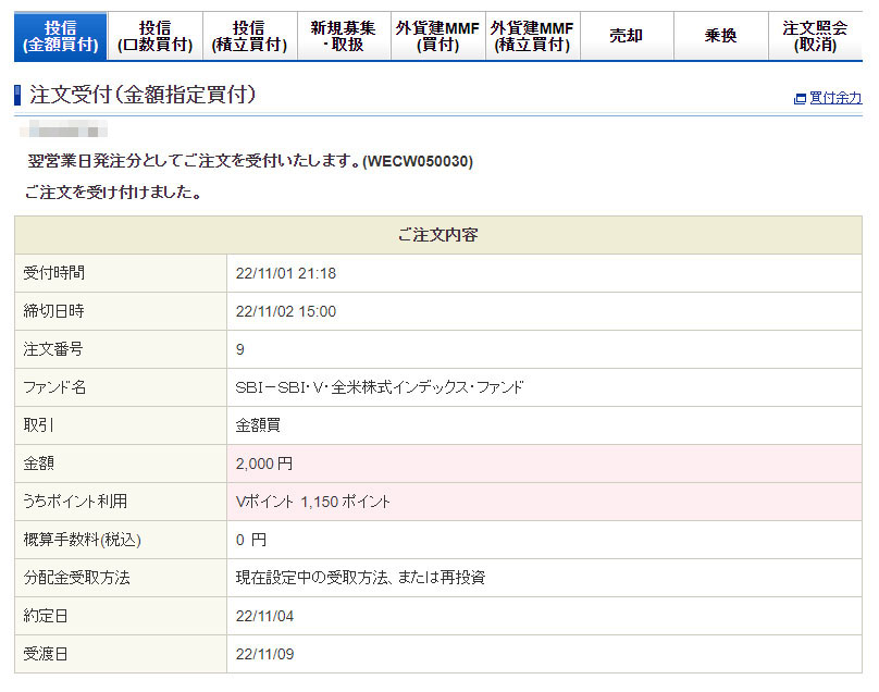 Vポイントが入ったのでSBI・V・全米株式インデックスファンドを2,000円分追加|2022.11.01 コメントを残す 月も変わった事ですし、またまた「Vポイント」が少し溜まったのでSBI・V・全米株式に追加投資です!今回は1,150ポイント分を消費する為に2,000円分を金額指定買付で購入です。ですので口座からの持ち出しは850円になります。 もう馴染みの金額指定買付 約定予定日は11月4日です。 毎度毎度ですがこのSBI証券の「SBI・V・全米株式」は基本、積立放置でVポイントが入ったら1,000円単位になるように「金額指定買付」でスポット購入です。