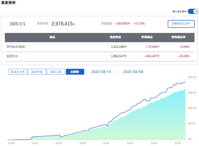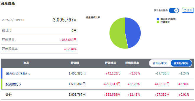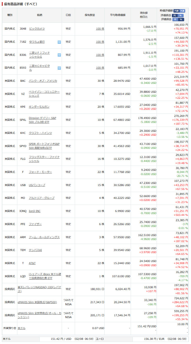 先月から僅か31,787円の上積みにとどまりました。IONQを現金化したのもありますが全体的に軟調な1ヶ月でした。米国は横ばいでしたが日本株が足を引っ張っています(インドもですがwww)。結局、60,000円ぐらいは入金してますので資産的にはプラスですが利幅は減りました。
