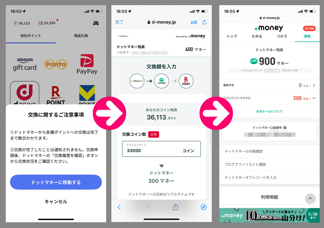 クラシルリワードのコインが貯まったのでドットマネーに変換|2025.2.14